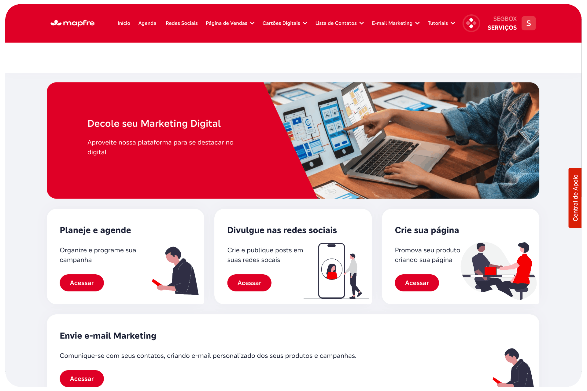 A Segbox, por meio da plataforma Otimize White Label, desenvolveu a MAPFRE +Digital, uma solução completa e personalizada para a realidade da MAPFRE. A plataforma foi criada com identidade visual própria, linguagem alinhada à marca e funcionalidades pensadas exclusivamente para ativar e apoiar os corretores no digital.