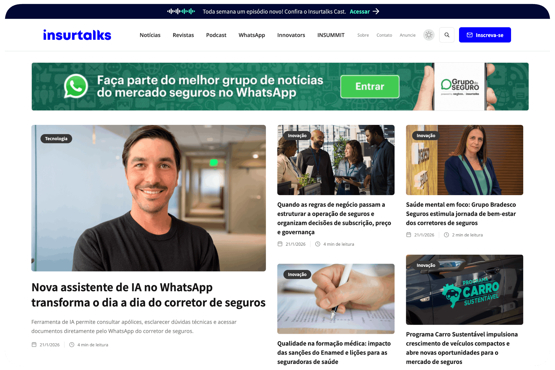 Desenvolvemos desde portais de corretores e sistemas de cotação multicálculo até aplicativos white-label e IAs generativas treinadas. Você traz a dor ou a ideia de inovação. Nós entregamos a solução pronta, segura e integrada ao ecossistema.